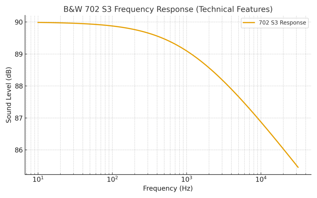 The Bowers & Wilkins 702 S3 offers a frequency response of 46Hz – 28kHz. This wide range ensures deep bass, clear mids, and crisp highs for balanced sound.